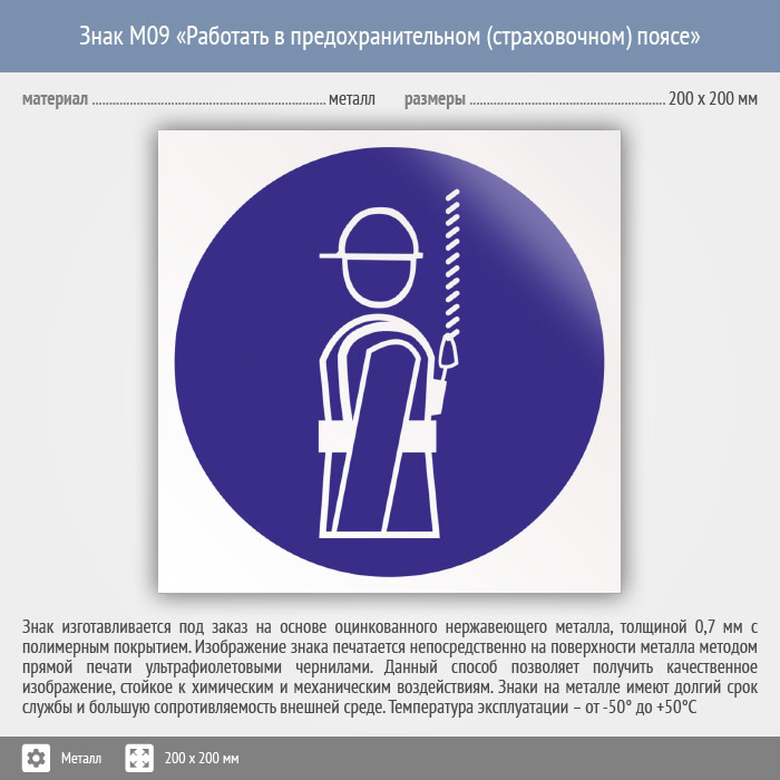 Знак M09 «Работать в предохранительном (страховочном) поясе» (металл, 200х200 мм) в Ачинске купить