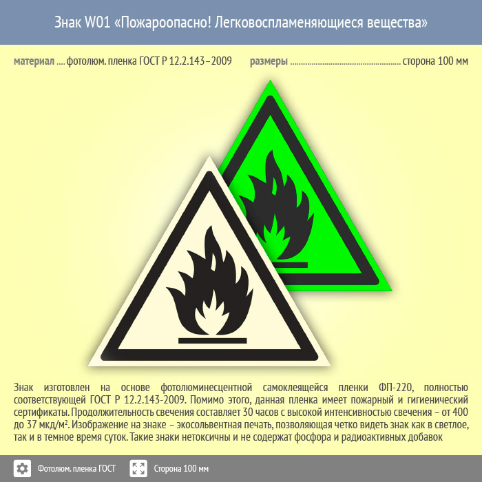 Знак W01 «Пожароопасно! легковоспламеняющиеся вещества» (фотолюминесцентная пленка ГОСТ 34428-2018, сторона 100 мм) в Ачинске купить