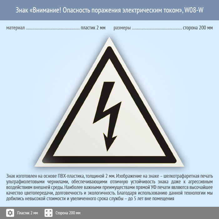 Знак W08-W «Внимание! опасность поражения электрическим током» (белый, пластик, сторона 200 мм) в Ачинске купить