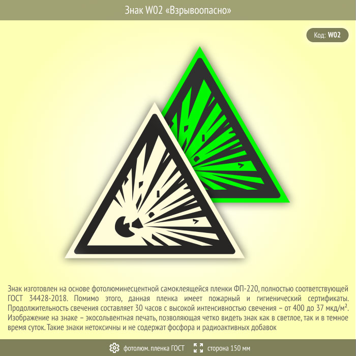Знак W02 «Взрывоопасно» (фотолюминесцентная пленка ГОСТ 34428-2018, сторона 150 мм) в Ачинске купить