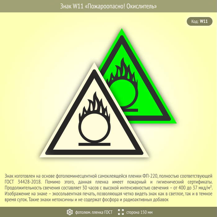 Знак W11 «Пожароопасно! окислитель» (фотолюминесцентная пленка ГОСТ 34428-2018, сторона 150 мм) в Ачинске купить