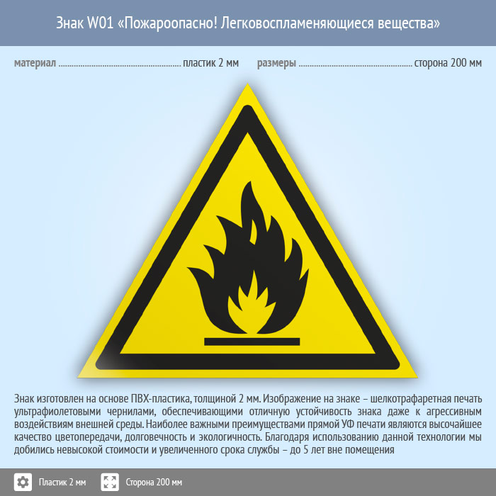 Знак W01 «Пожароопасно! легковоспламеняющиеся вещества» (пластик, сторона 200 мм) в Ачинске купить
