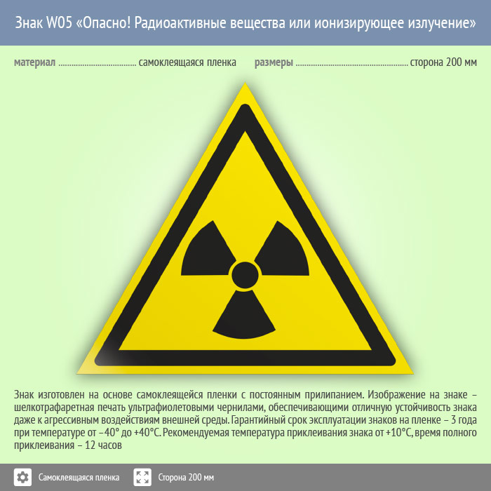 Знак W05 «Опасно! радиоактивные вещества или ионизирующее излучение» (пленка, сторона 200 мм) в Ачинске купить