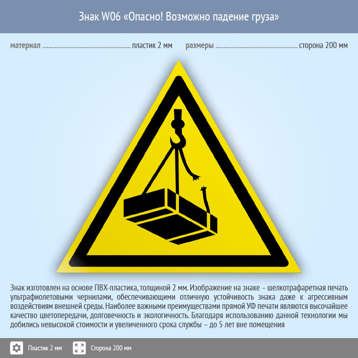 Знак W06 «Опасно! возможно падение груза» (пластик, сторона 200 мм) в Ачинске купить