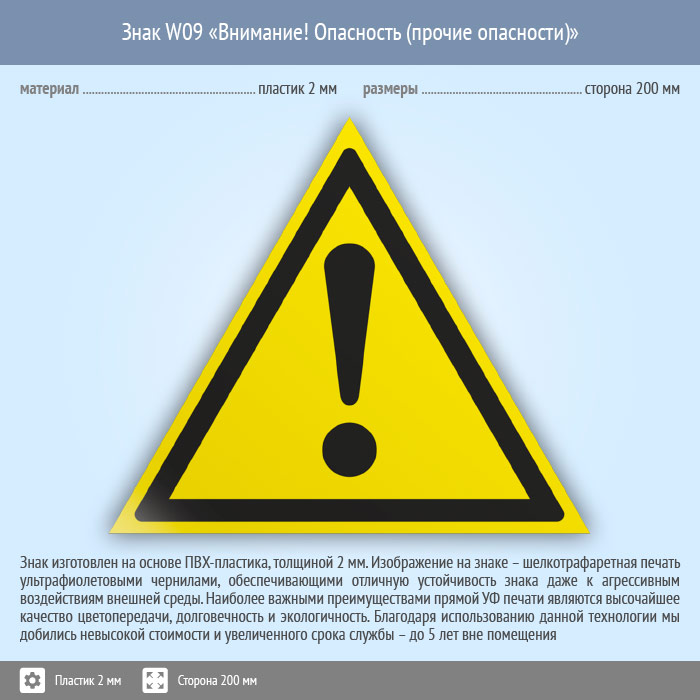 Знак W09 «Внимание! опасность (прочие опасности)» (пластик, сторона 200 мм) в Ачинске купить