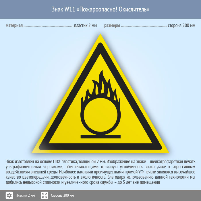 Знак W11 «Пожароопасно! окислитель» (пластик, сторона 200 мм) в Ачинске купить