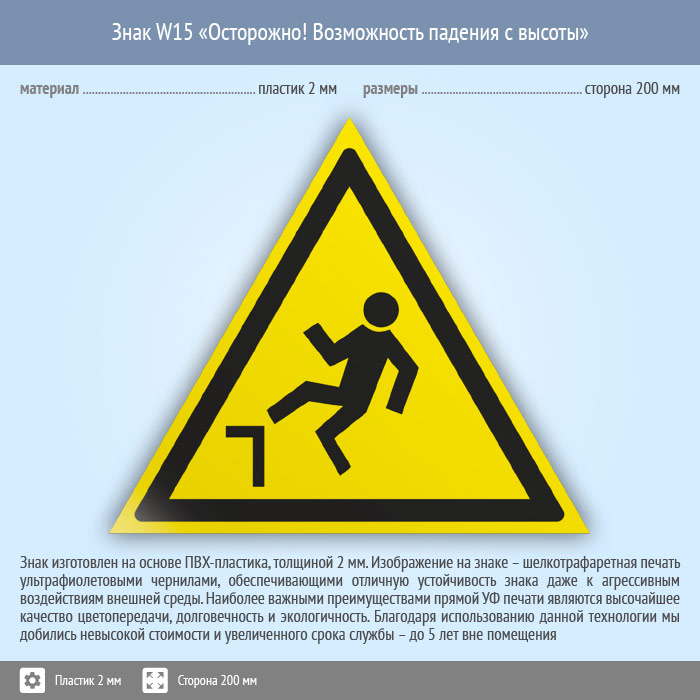 Знак W15 «Осторожно! возможность падения с высоты» (пластик, сторона 200 мм) в Ачинске купить