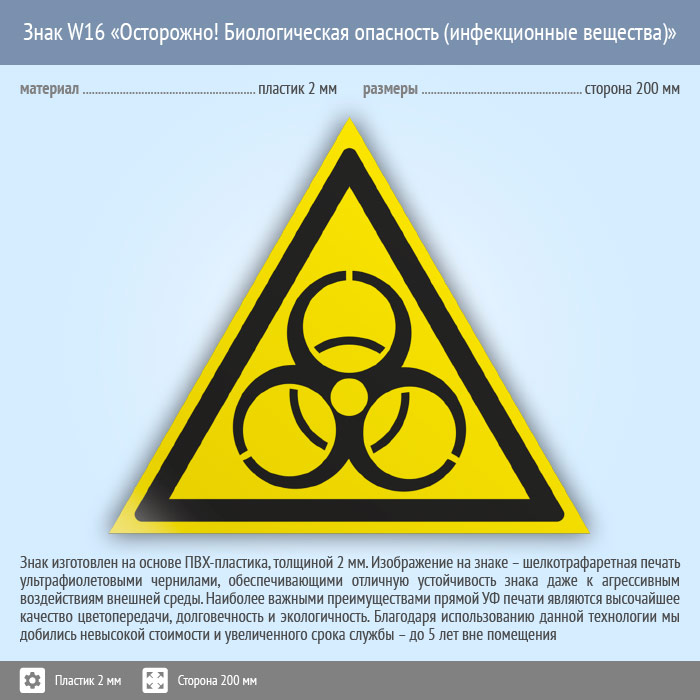 Знак W16 «Осторожно! биологическая опасность (инфекционные вещества)» (пластик, сторона 200 мм) в Ачинске купить