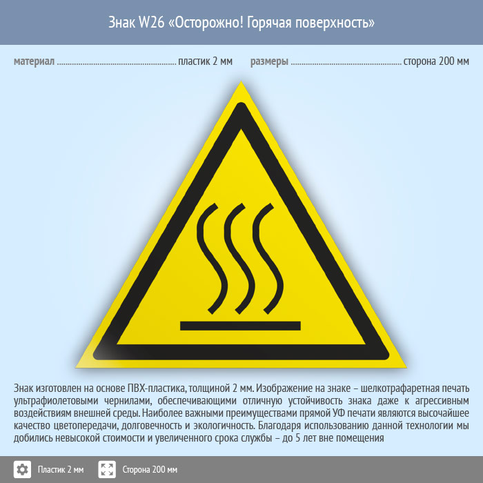 Знак W26 «Осторожно! горячая поверхность» (пластик, сторона 200 мм) в Ачинске купить