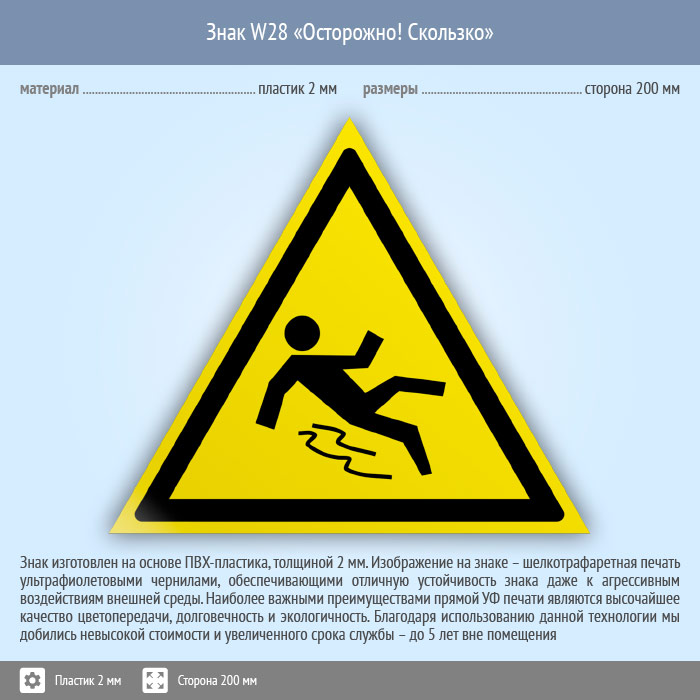 Знак W28 «Осторожно! скользко» (пластик, сторона 200 мм) в Ачинске купить