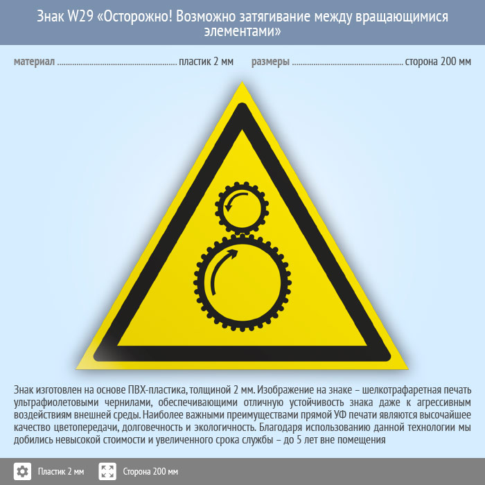 Знак W29 «Осторожно! возможно затягивание между вращающимися элементами» (пластик, сторона 200 мм) в Ачинске купить