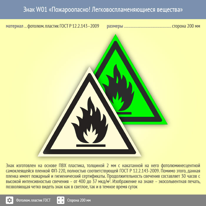 Знак W01 «Пожароопасно! Легковоспламеняющиеся вещества» (фотолюминесцентный пластик ГОСТ 34428-2018, сторона 200 мм) в Ачинске купить