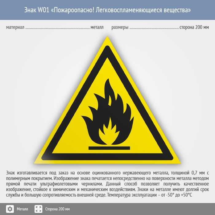 Знак W01 «Пожароопасно! легковоспламеняющиеся вещества» (металл, сторона 200 мм) в Ачинске купить