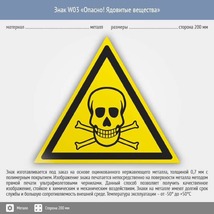 Знак W03 «Опасно! ядовитые вещества» (металл, сторона 200 мм) в Ачинске купить