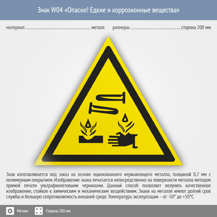 Знак W04 «Опасно! едкие и коррозионные вещества» (металл, сторона 200 мм) в Ачинске купить