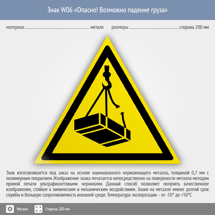 Знак W06 «Опасно! возможно падение груза» (металл, сторона 200 мм) в Ачинске купить