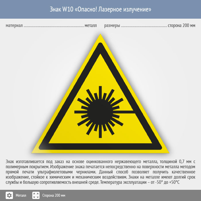 Знак W10 «Опасно! лазерное излучение» (металл, сторона 200 мм) в Ачинске купить