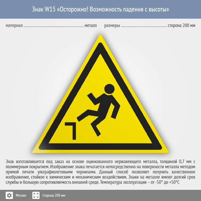 Знак W15 «Осторожно! возможность падения с высоты» (металл, сторона 200 мм) в Ачинске купить