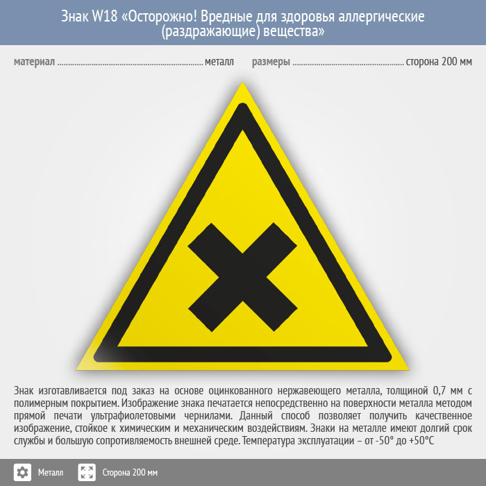 Знак W18 «Осторожно! вредные для здоровья аллергические (раздражающие) вещества» (металл, сторона 200 мм) в Ачинске купить