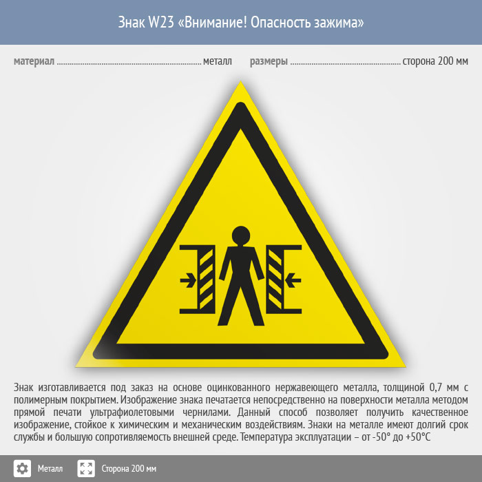 Знак W23 «Внимание! опасность зажима» (металл, сторона 200 мм) в Ачинске купить