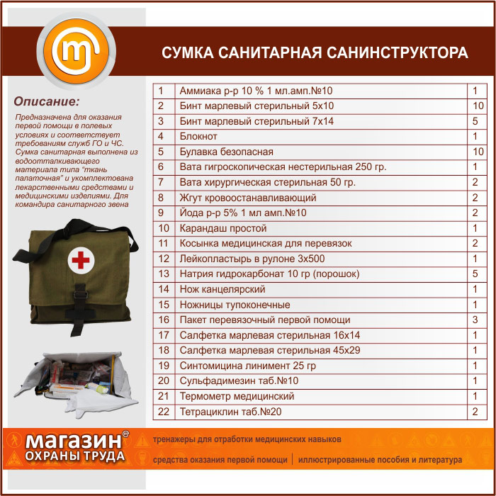 Сумка санитарная для оказания первой помощи подразделениям сил ГО (приказ № 61н от 08.02.2013г.) | Сумка санитарная для оказания первой помощи подразделениям сил ГО (приказ № 61н от 08.02.2013г.) |