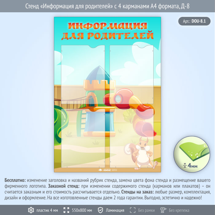 Стенд «Информация для родителей» с 4 карманами А4 формата (DOU-8.1) в Ачинске купить