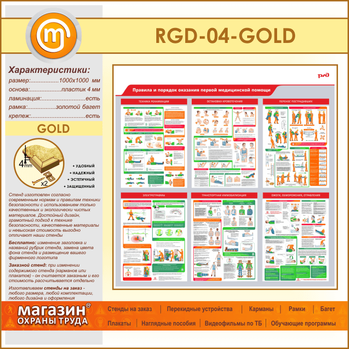 Стенд «Правила и порядок оказания первой медицинской помощи» (RGD-04-GOLD) в Ачинске купить