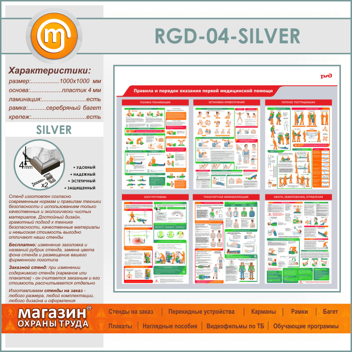Стенд «Правила и порядок оказания первой медицинской помощи» (RGD-04-SILVER) в Ачинске купить