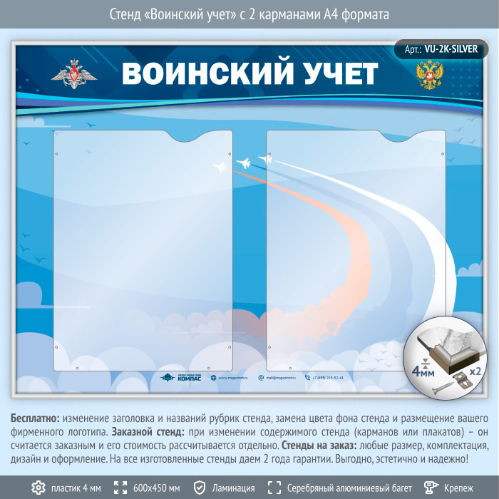 Стенд «Воинский учет» с 2 карманами А4 формата (VU-2K-SILVER) в Ачинске купить