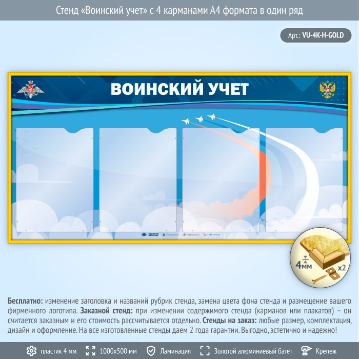 Стенд «Воинский учет» с 4 карманами А4 формата в один ряд (VU-4K-H-GOLD) в Ачинске купить