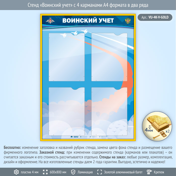 Стенд «Воинский учет» с 4 карманами А4 формата в два ряда (VU-4K-V-GOLD) в Ачинске купить