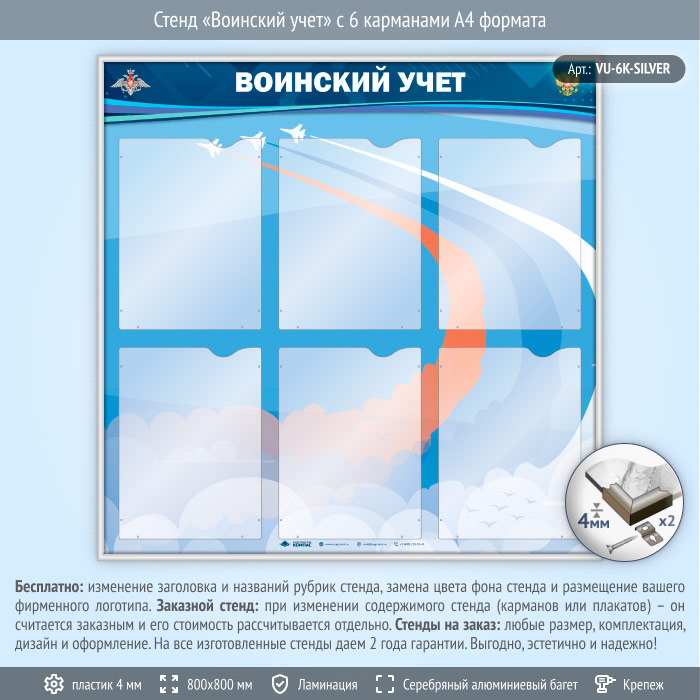 Стенд «Воинский учет» с 6 карманами А4 формата (VU-6K-SILVER) в Ачинске купить