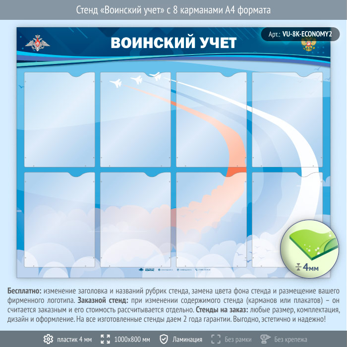 Стенд «Воинский учет» с 8 карманами А4 формата (VU-8K-ECONOMY2) в Ачинске купить