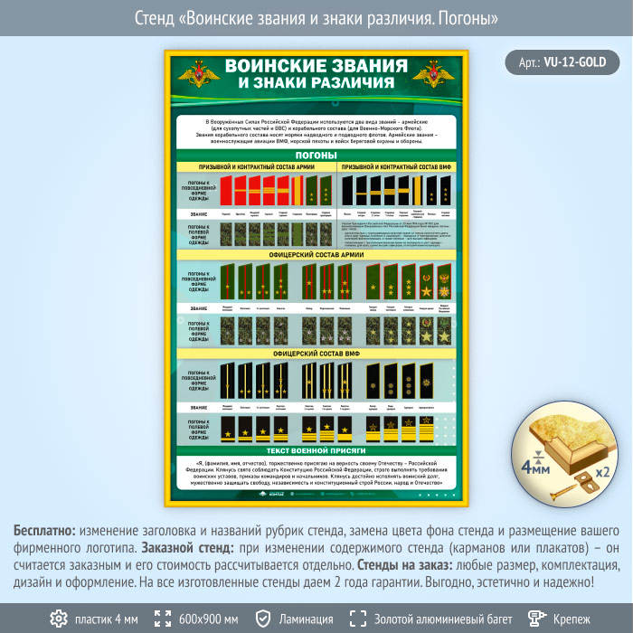Стенд «Воинские звания и знаки различия. Погоны» (VU-12-GOLD) в Ачинске купить