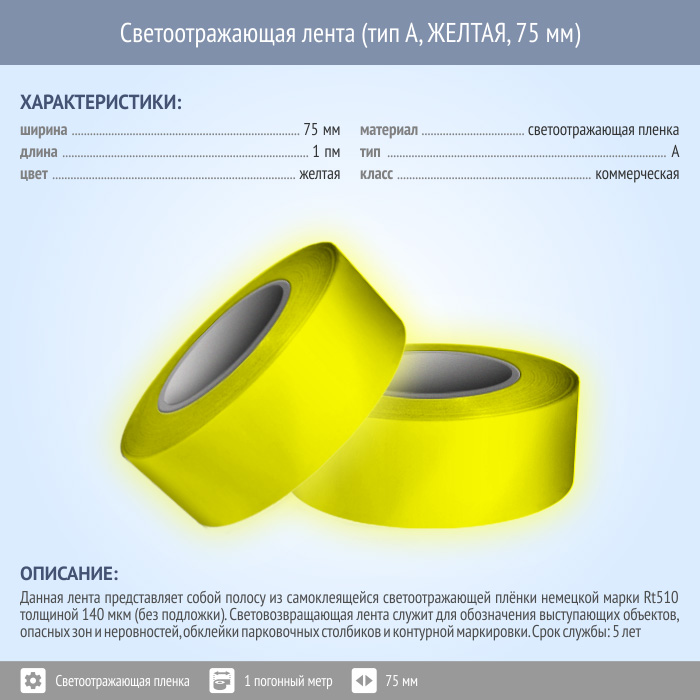 Светоотражающая однородная лента (тип А, ЖЕЛТАЯ, 75 мм х 1 п.м.) в Ачинске купить