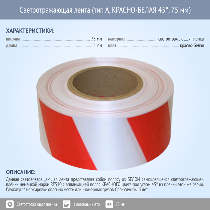 Светоотражающая сигнальная лента (тип А, КРАСНО-БЕЛАЯ 45°, 75 мм х 1 п.м.) в Ачинске купить