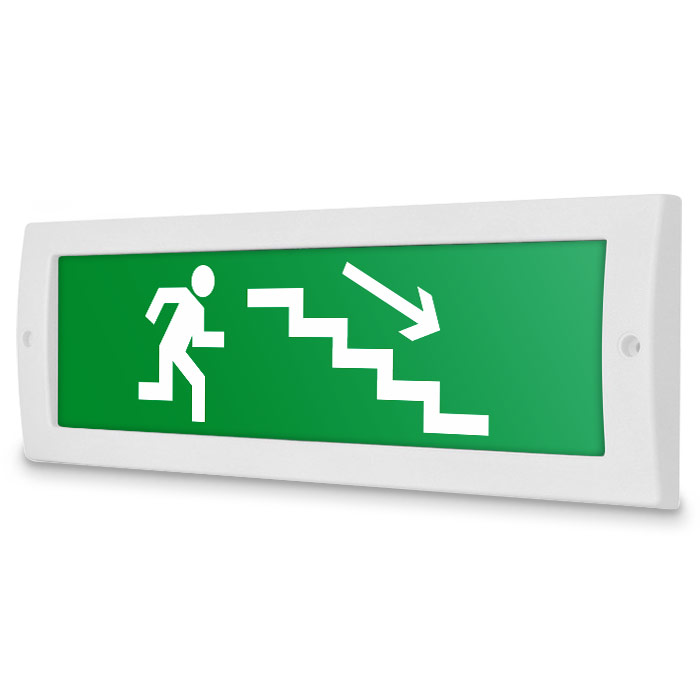 Световое табло «Направление к эвакуационному выходу по лестнице вниз (правосторонний)», Молния (12В) в Ачинске купить