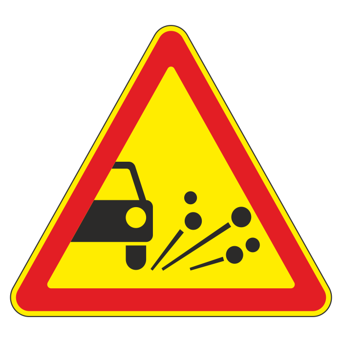 Дорожный знак 1.18 «Выброс гравия» (временный) (металл 0,8 мм, I типоразмер: сторона 700 мм, С/О пленка: тип В алмазная) в Ачинске купить