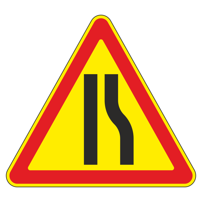 Дорожный знак 1.20.2 «Сужение дороги» (временный) (металл 0,8 мм, I типоразмер: сторона 700 мм, С/О пленка: тип В алмазная) в Ачинске купить