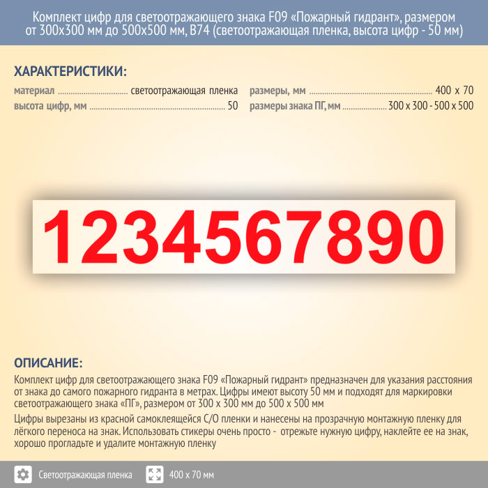 Комплект цифр для светоотражающего знака F09 «Пожарный гидрант», размером от 300х300 мм до 500х500 мм, В74 (светоотражающая пленка, 400х70 мм, высота цифр - 50 мм) в Ачинске купить
