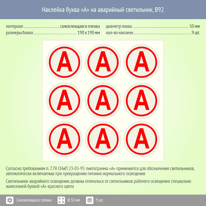 Наклейка буква «А» на аварийный светильник, B92 (пленка, диаметр 50 мм, блок 9 штук, 190х190 мм) в Ачинске купить