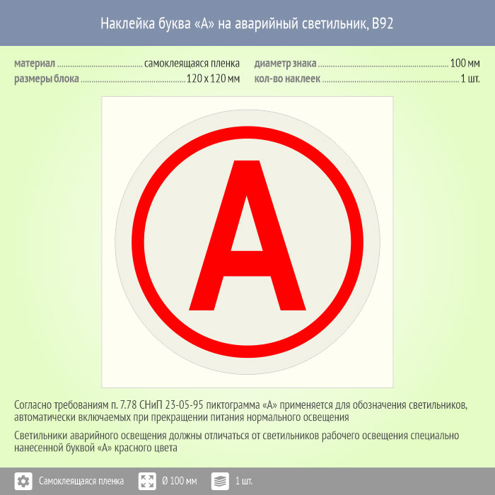 Наклейка буква «А» на аварийный светильник, B92 (пленка, диаметр 100 мм, 120х120 мм) в Ачинске купить