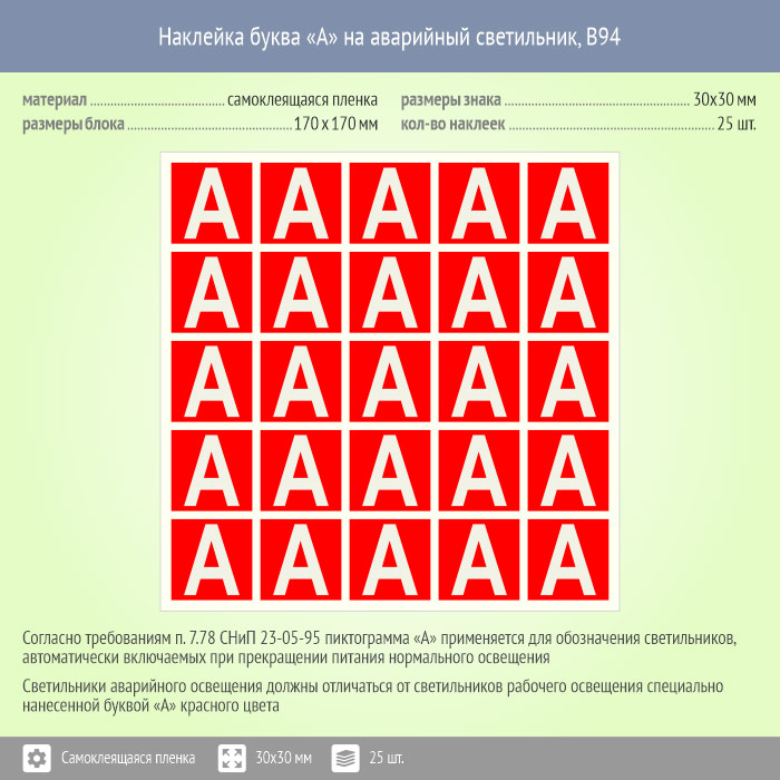 Наклейка буква «А» на аварийный светильник, B94 (пленка, 30х30 мм, блок 25 штук, 170х170 мм) в Ачинске купить