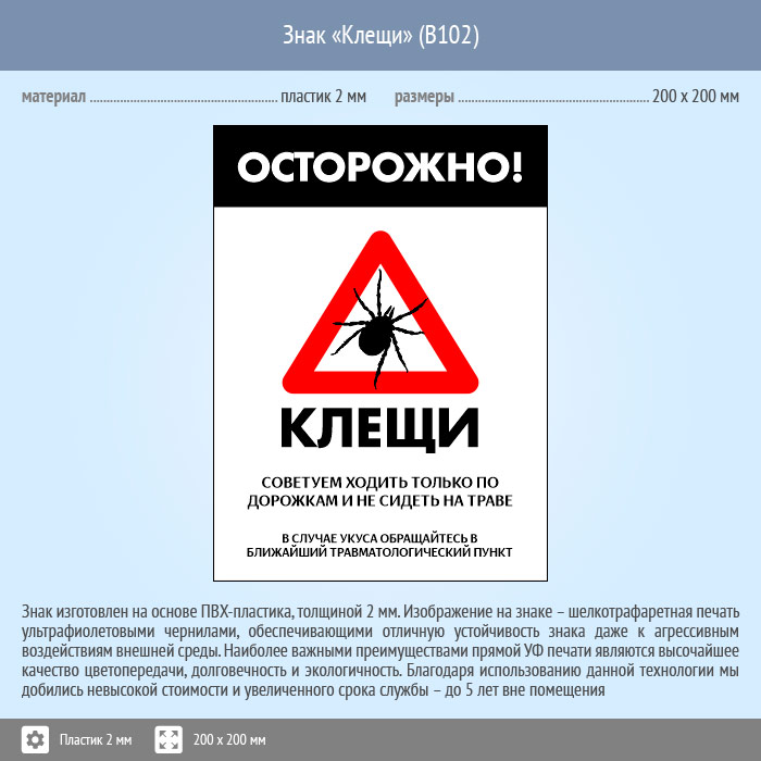 Знак «Осторожно! Клещи», B102 (пластик, 400х600 мм) в Ачинске купить