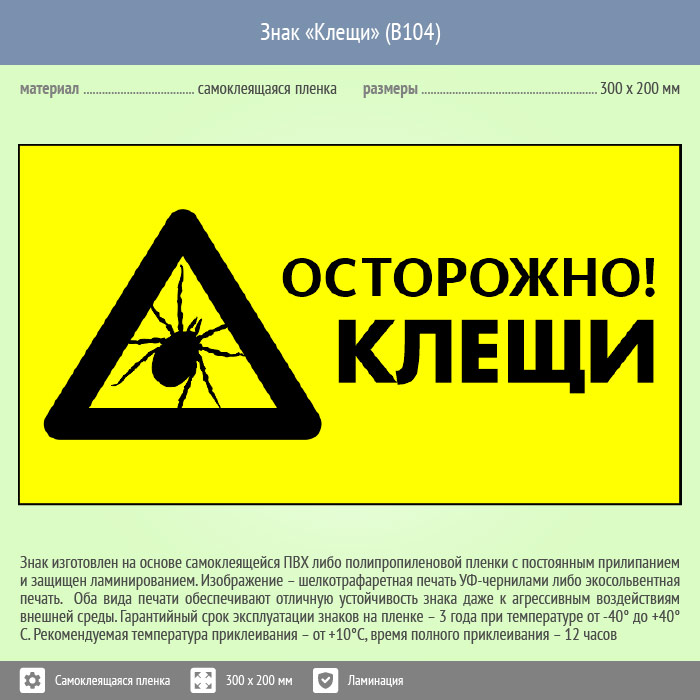 Знак «Осторожно! Клещи», B104 (пленка c ламинированием, 400х300 мм) в Ачинске купить