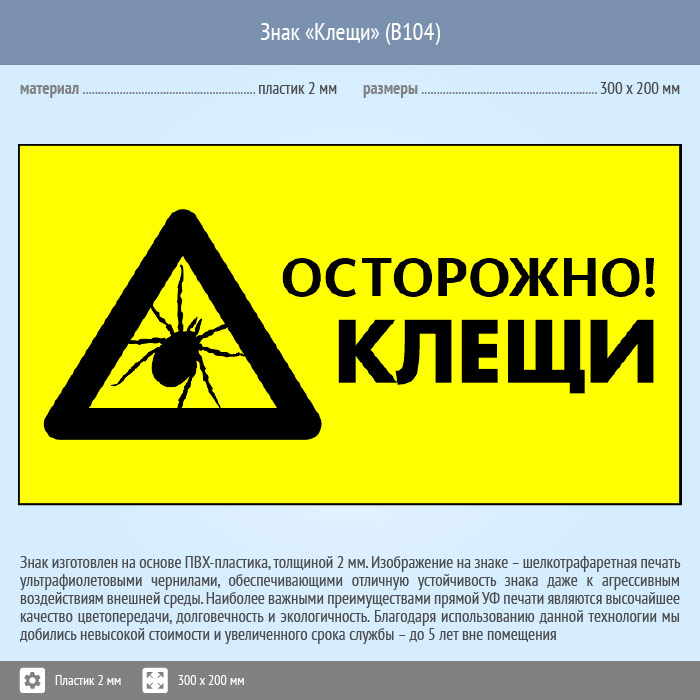 Знак «Осторожно! Клещи», B104 (пластик, 400х300 мм) в Ачинске купить