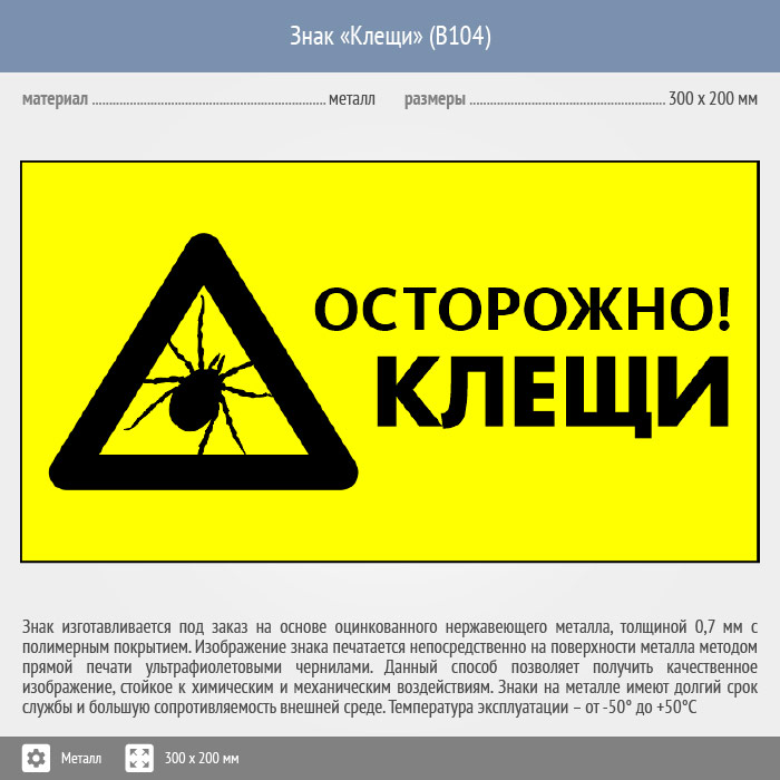 Знак «Осторожно! Клещи», B104 (металл, 400х300 мм) в Ачинске купить
