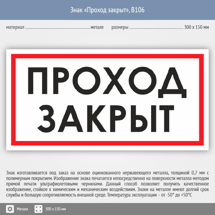 Знак «Проход закрыт», B106 (металл, 300х150 мм) в Ачинске купить