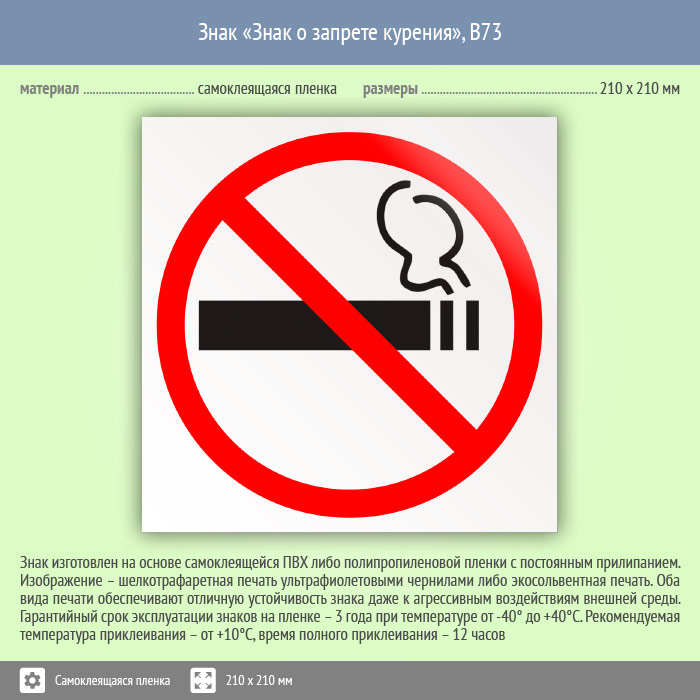 Знак «Знак о запрете курения», B73 (пленка, 210х210 мм) в Ачинске купить