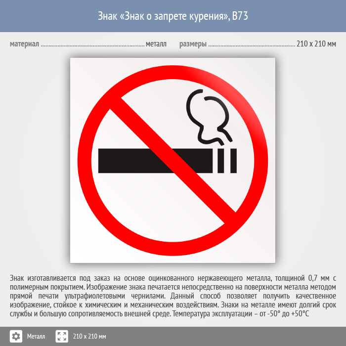 Знак «Знак о запрете курения», B73 (металл, 210х210 мм) в Ачинске купить